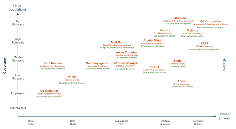 Notre analyse matricielle (voir ci-dessous) centrée sur une vingtaine d’entreprises fait notamment ressortir une grande diversité des publics visés. Si certaines d’entre elles peuvent être qualifiées d’élitistes, d’autres se révèlent beaucoup plus inclusives, dispensant des formations culturelles et stratégiques à une très grande partie du personnel.